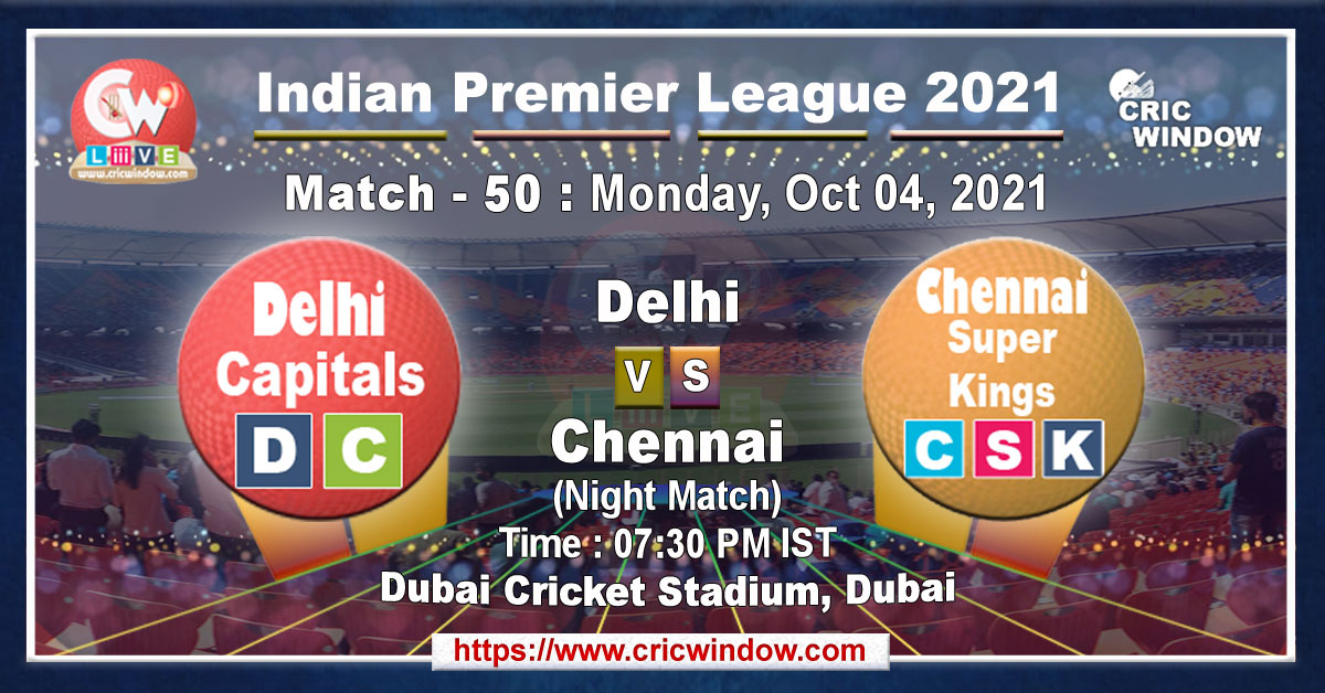 50th Match of the 14th season Indian Premier League 2021 will be played between Delhi Capitals vs Chennai Super Kings on Monday, October 04, 2021 at Dubai Cricket Stadium, Dubai at 7:30 pm.