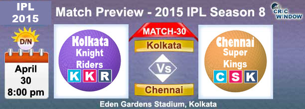 30th match of 2015 IPL season 8 will be played between Kolkata Knight Riders and Chennai super Kings at Eden Gardens Stadium, Kolkata. Putting into bat first by Kolkata, Chennai made quick start but lost wickets in regular interwals and managed to put 165 runs at the end of 20 overs. BB McCullum made quick 32 runs of just 12 runs. Kolkata in relpy bated well and registered very good win over Chennai by huge margins of 7 wkts. RV Uthappa played good inning of 80* runs but, AD Russell declared man of the match for his all round performances with 2 wickets and quick 55* runs.